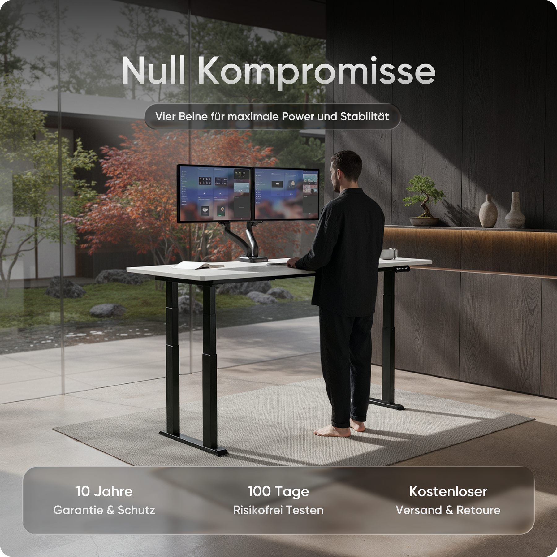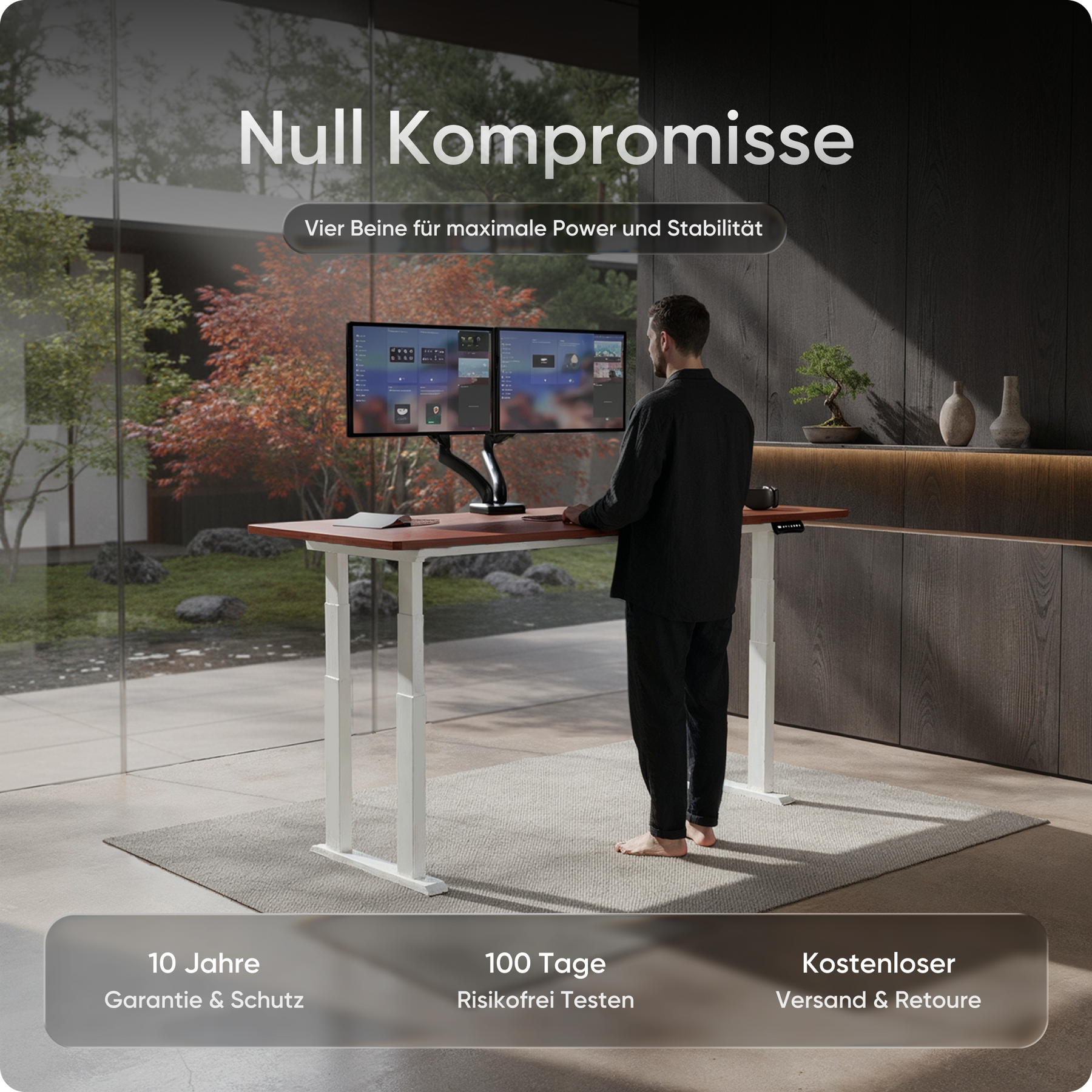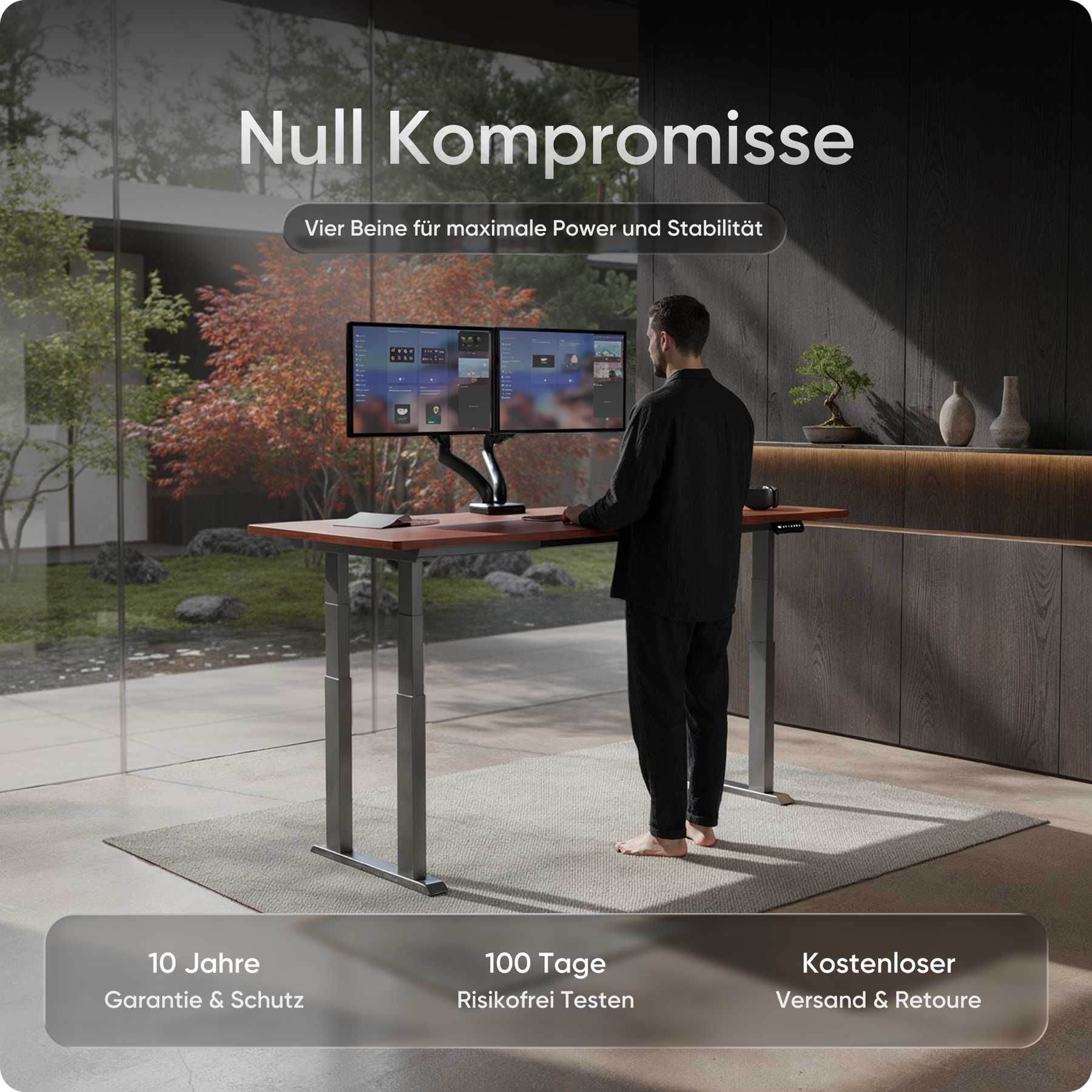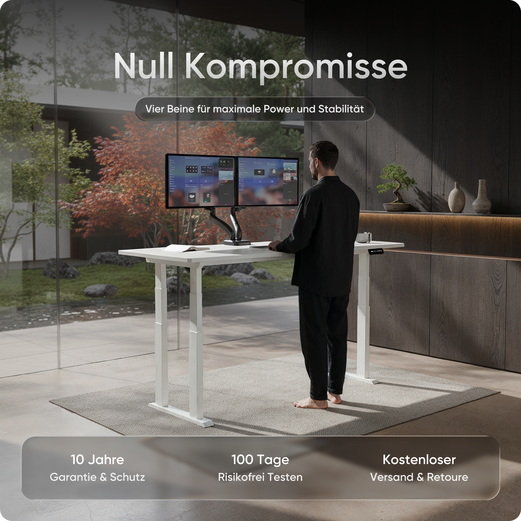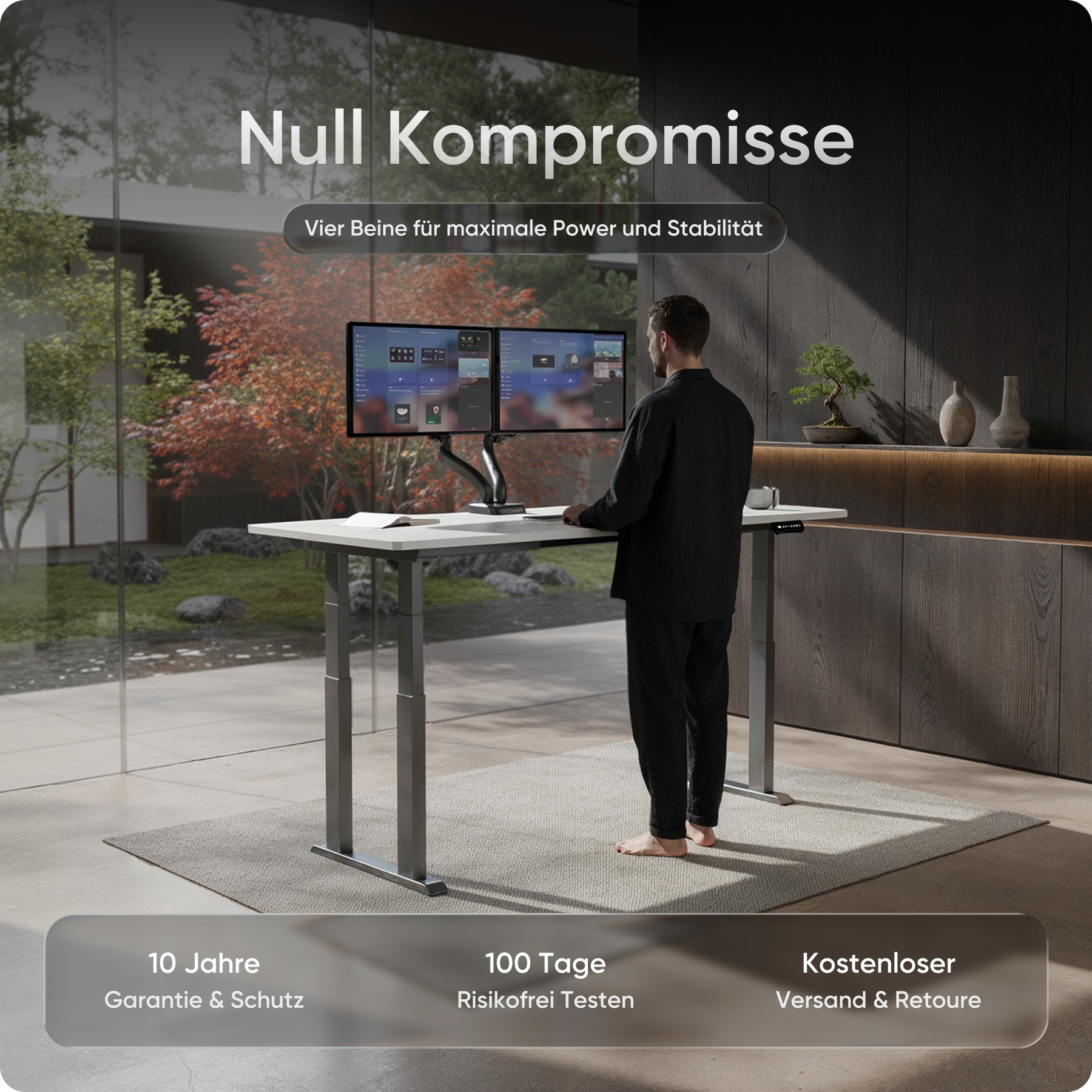 Erlebe die Revolution des stabilsten 4-beinigen höhenverstellbaren Schreibtisches.