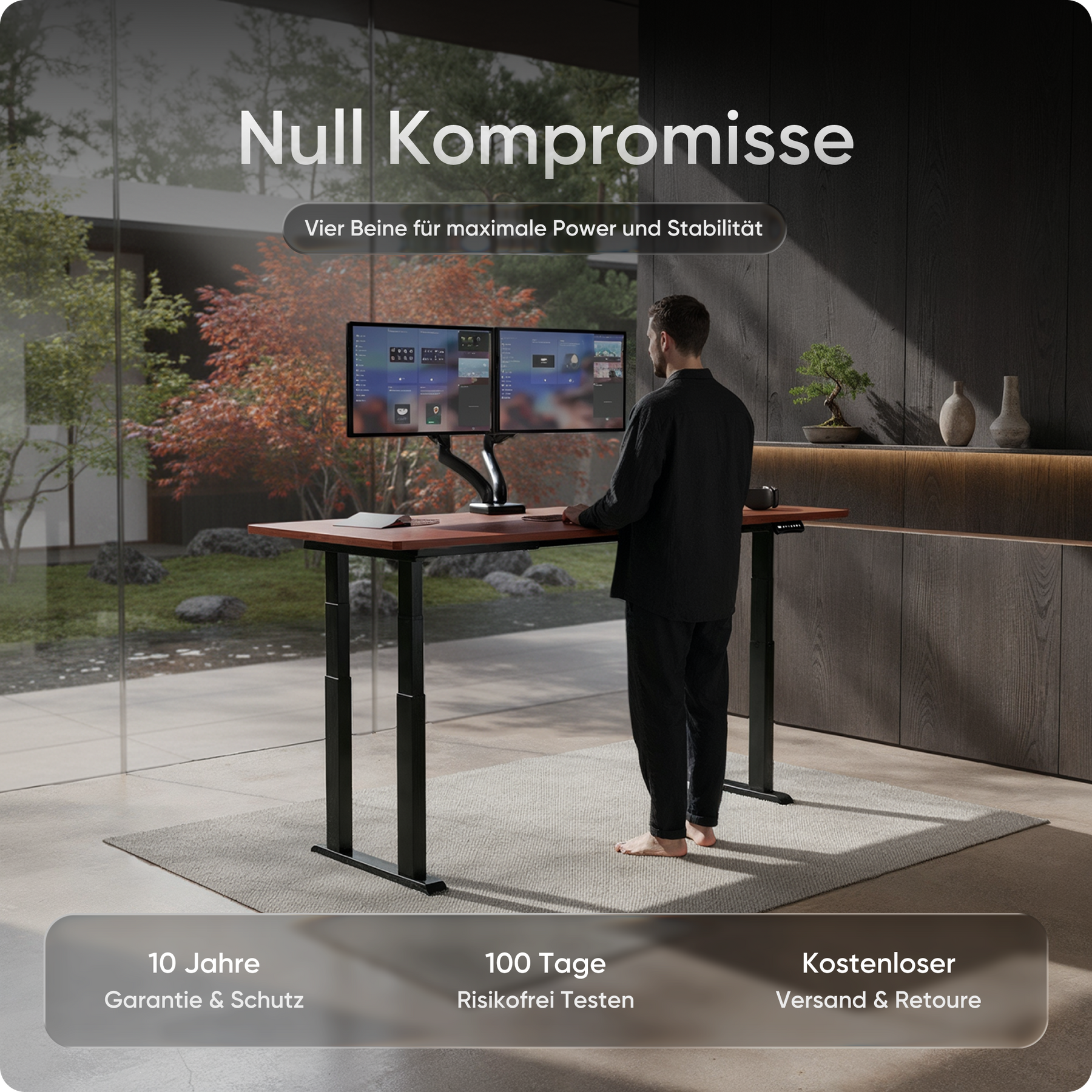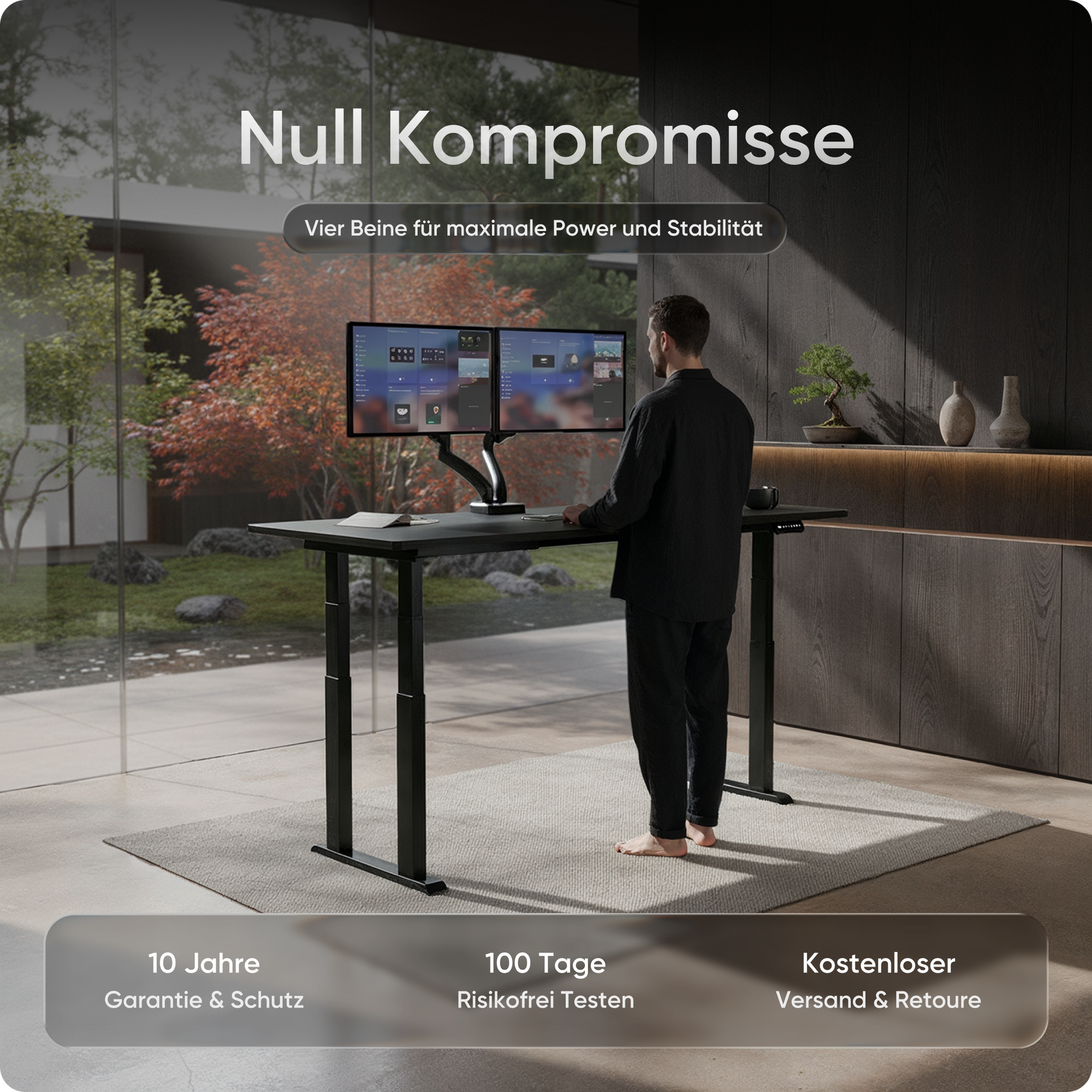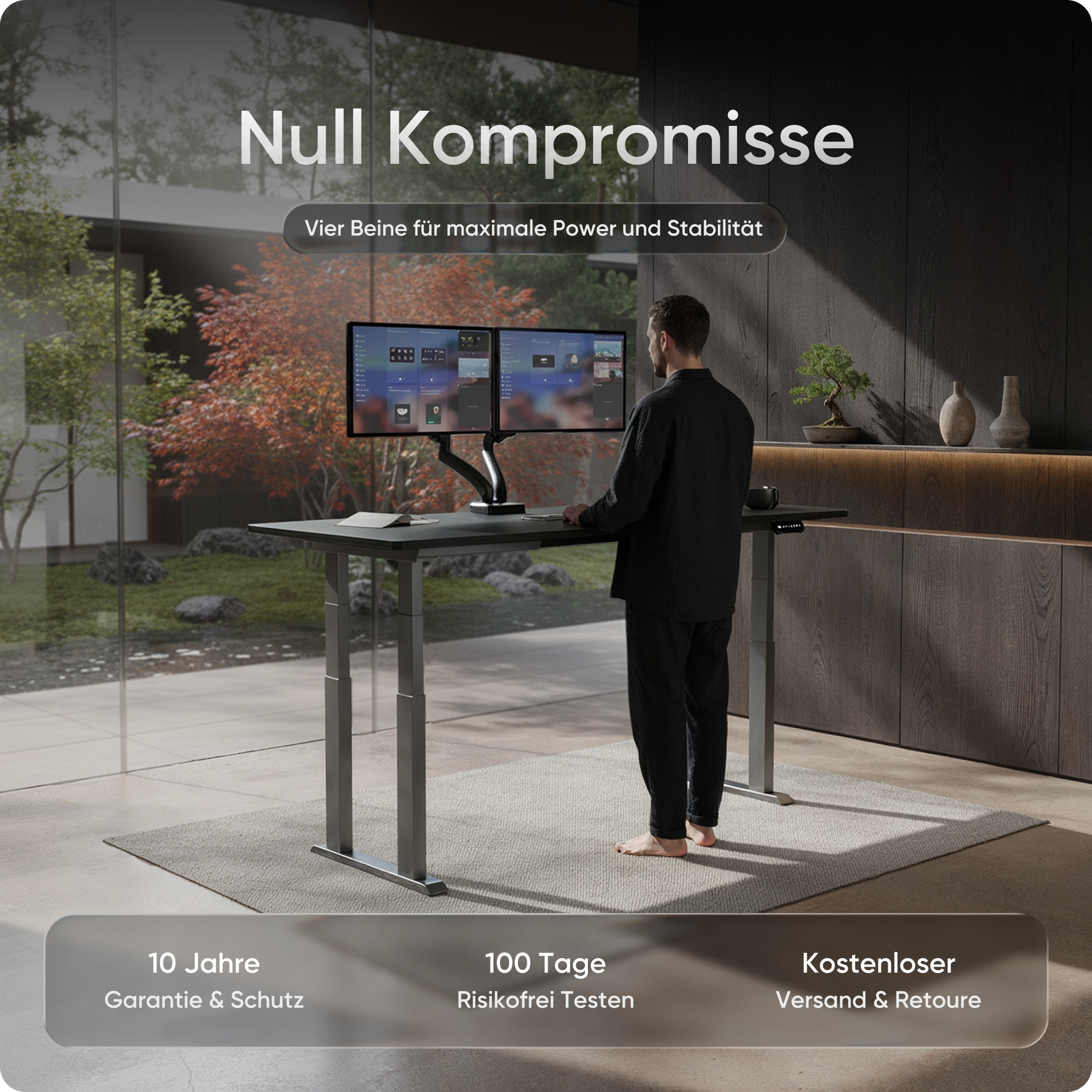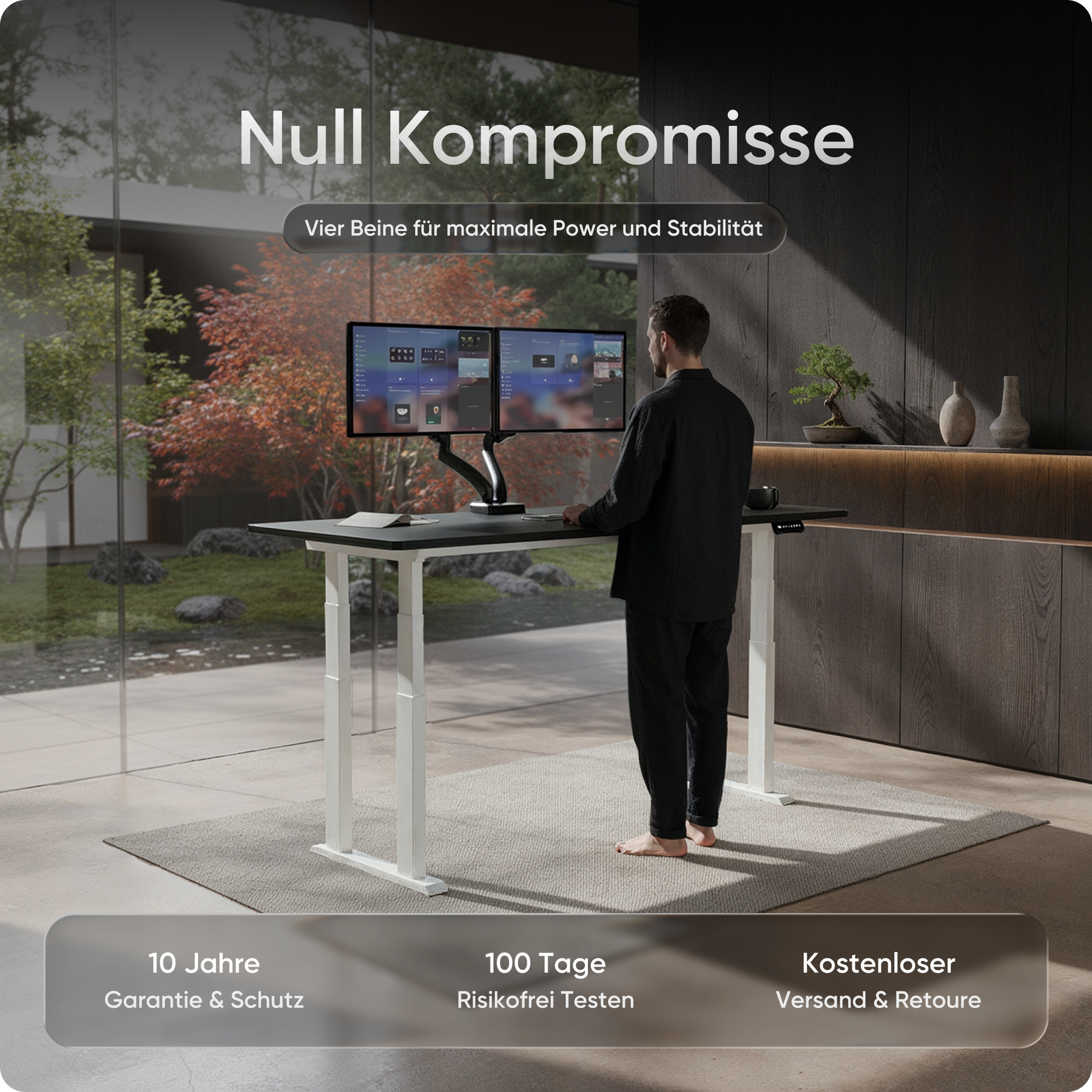 Erlebe die Revolution des stabilsten 4-beinigen höhenverstellbaren Schreibtisches.