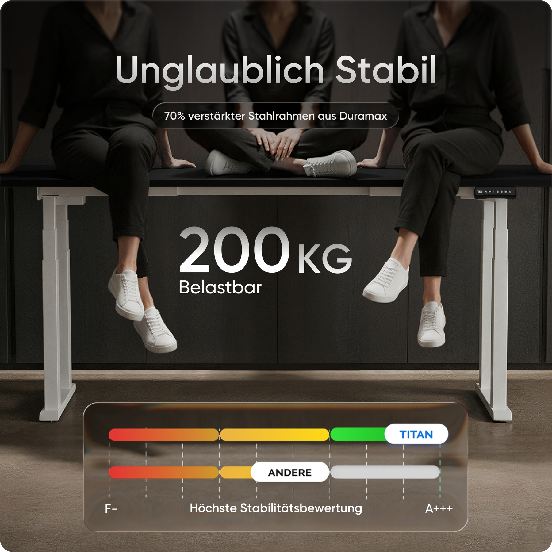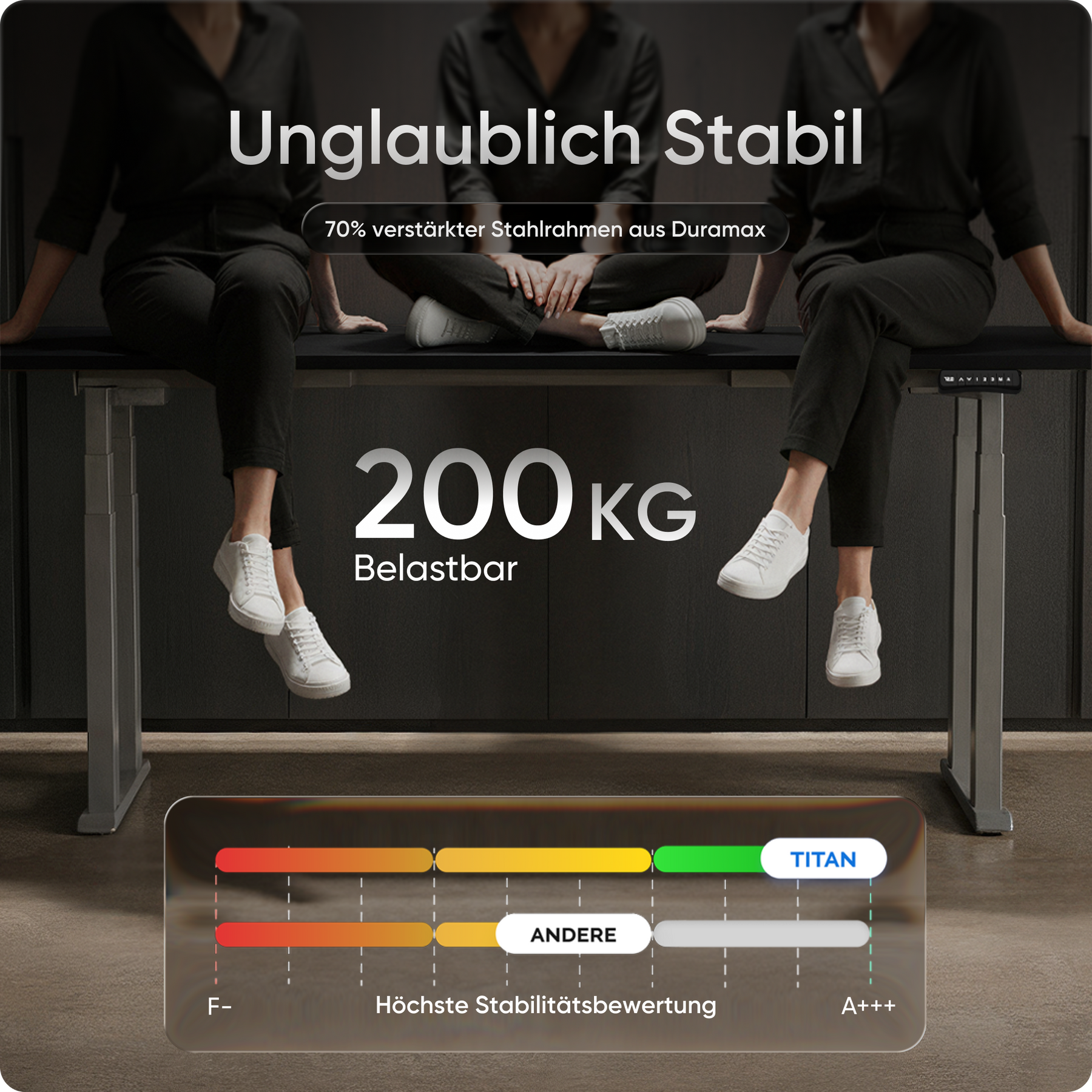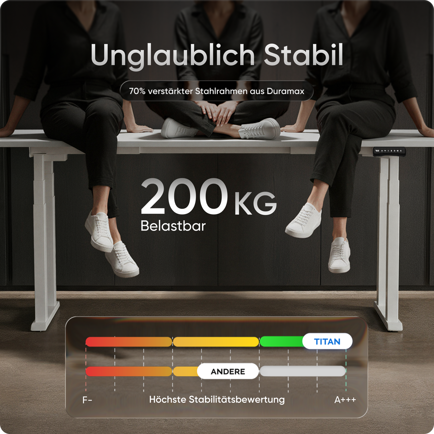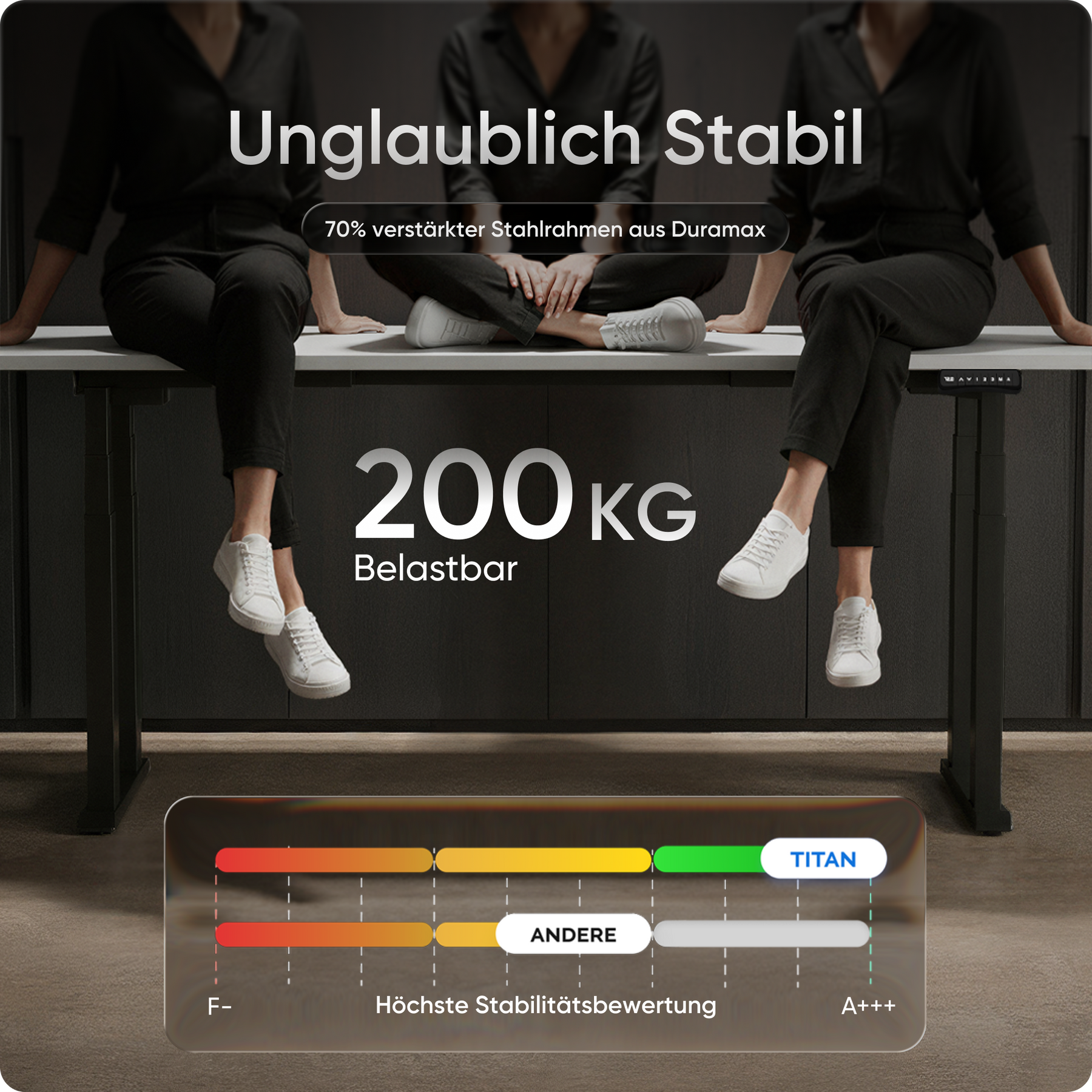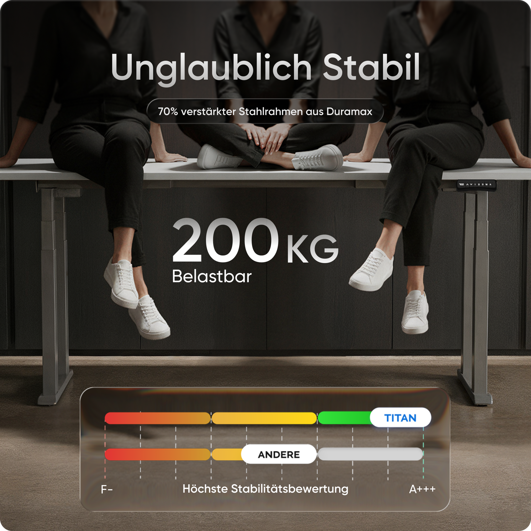 Erlebe die Revolution des stabilsten 4-beinigen höhenverstellbaren Schreibtisches.