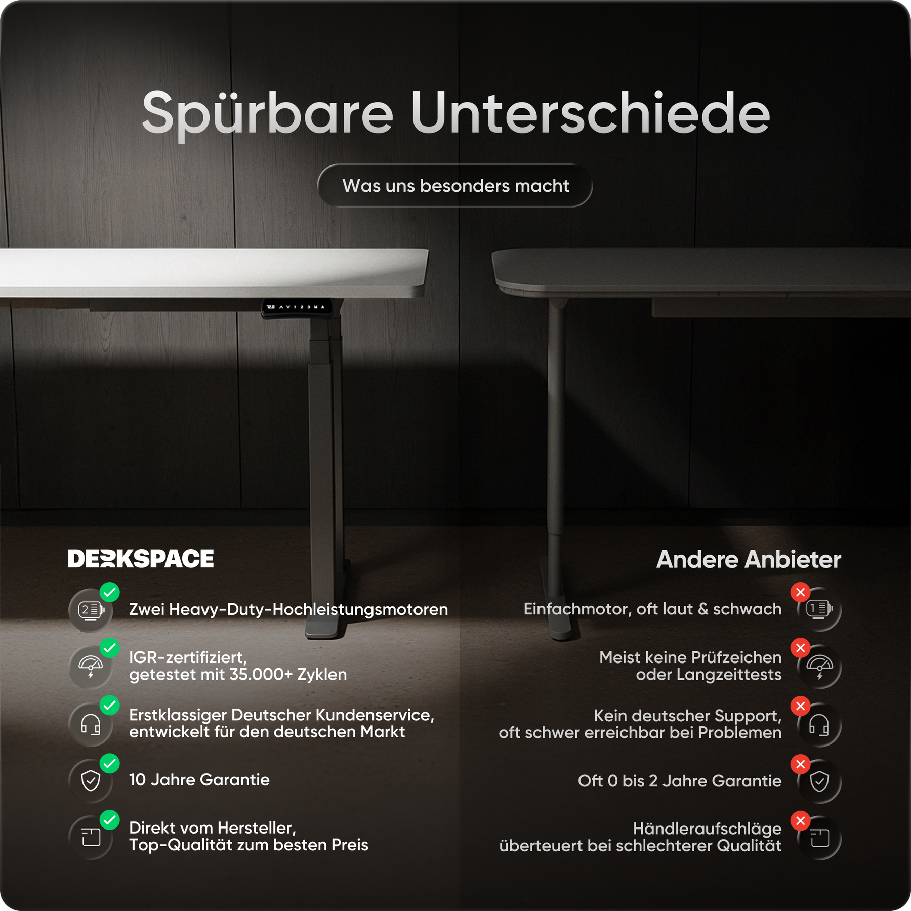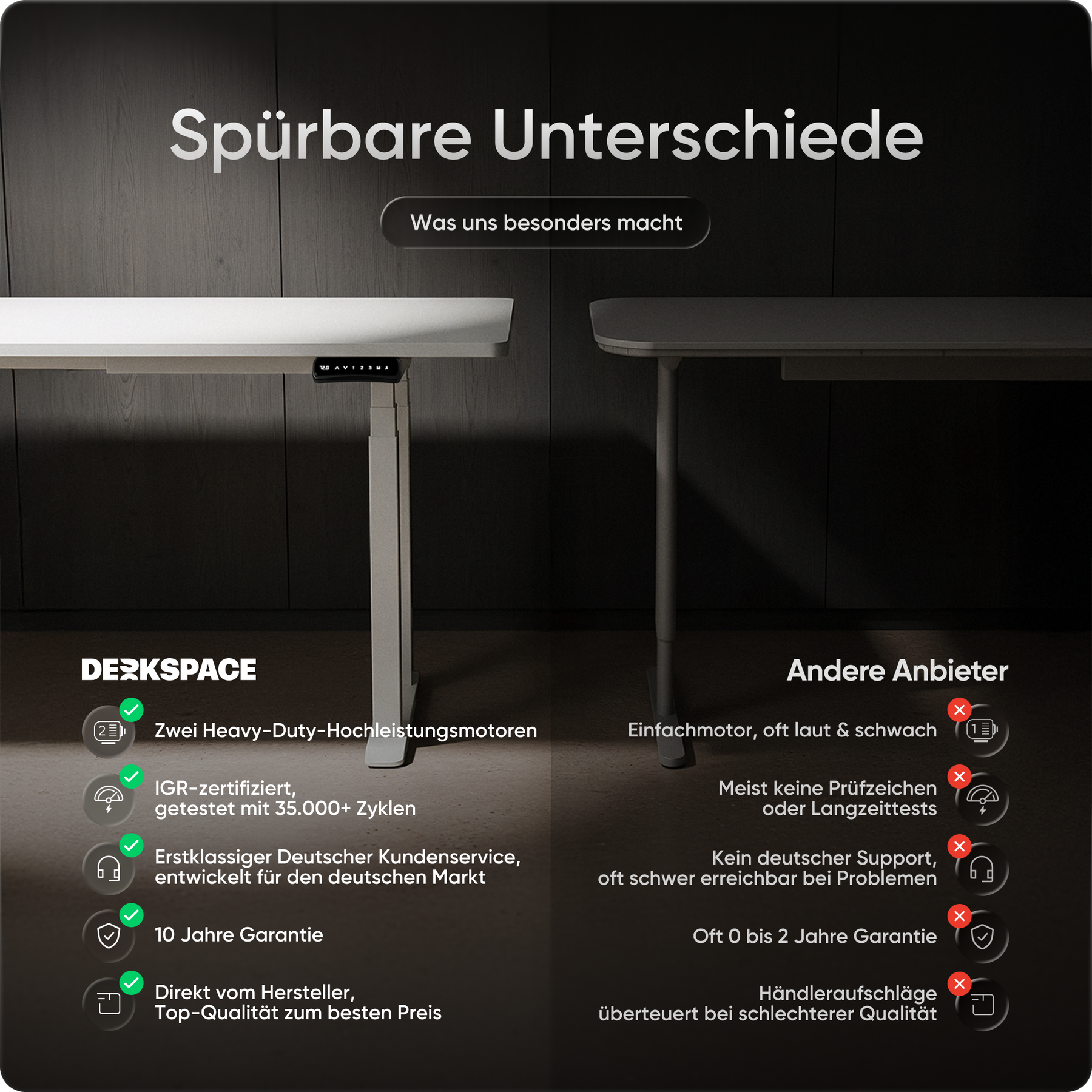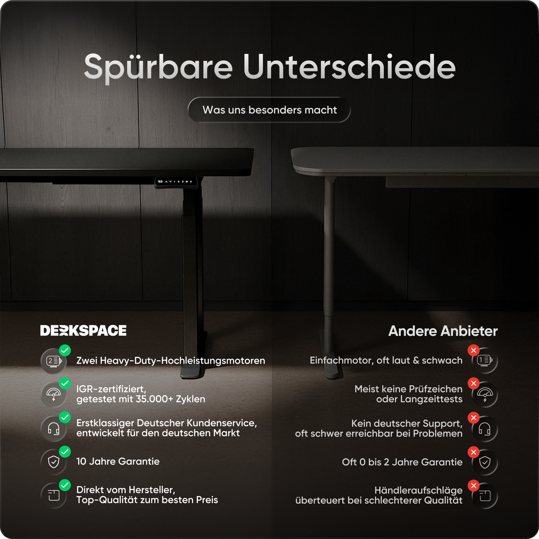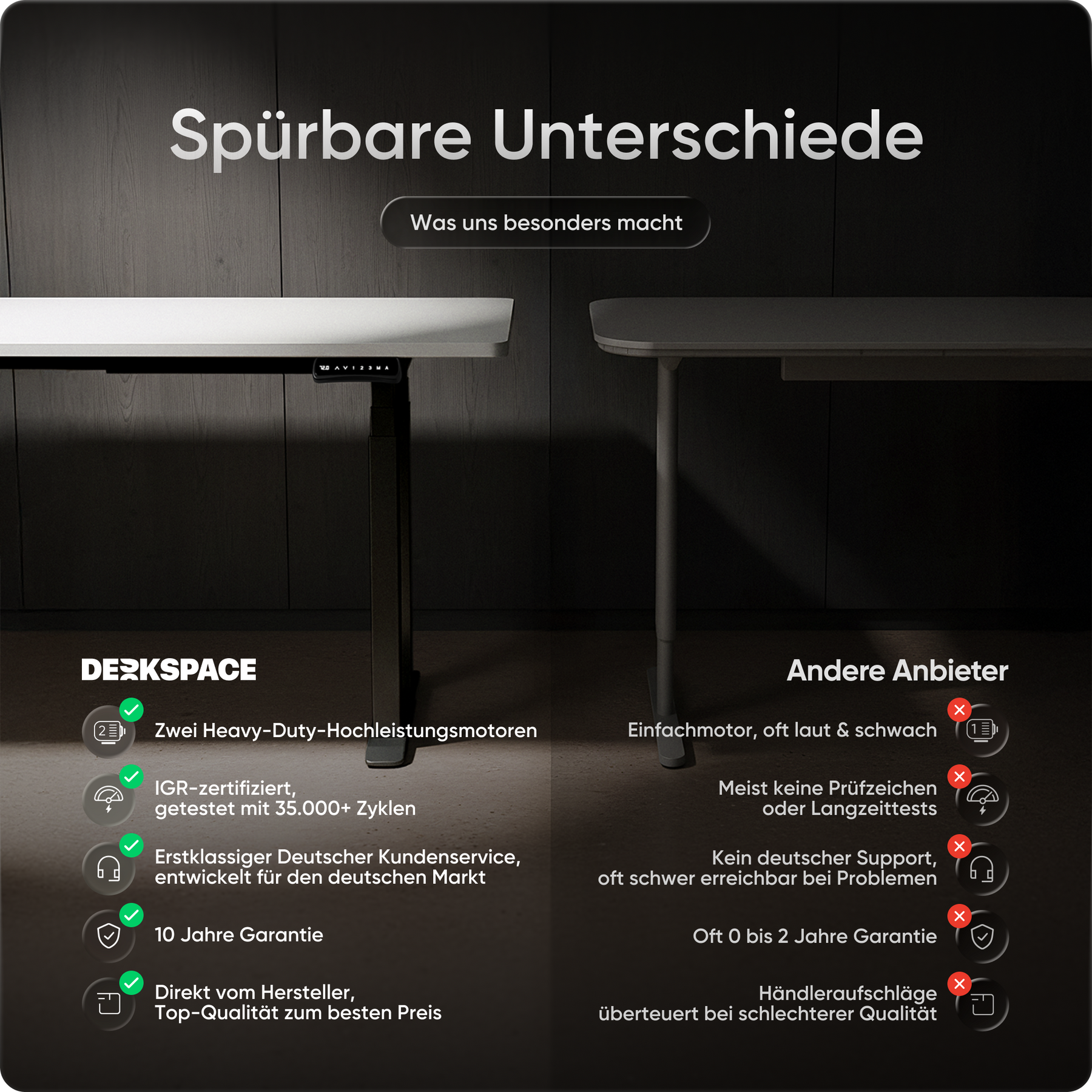 Kostenloser Versand und Rückversand für alle Produkte in Deutschland & Österreich. Andere Länder nur auf Anfrage – bitte kontaktiere uns unter support@deskspace.de.